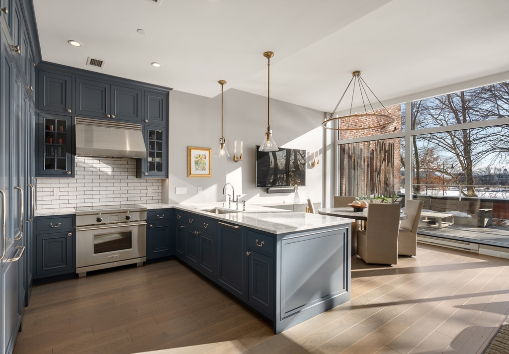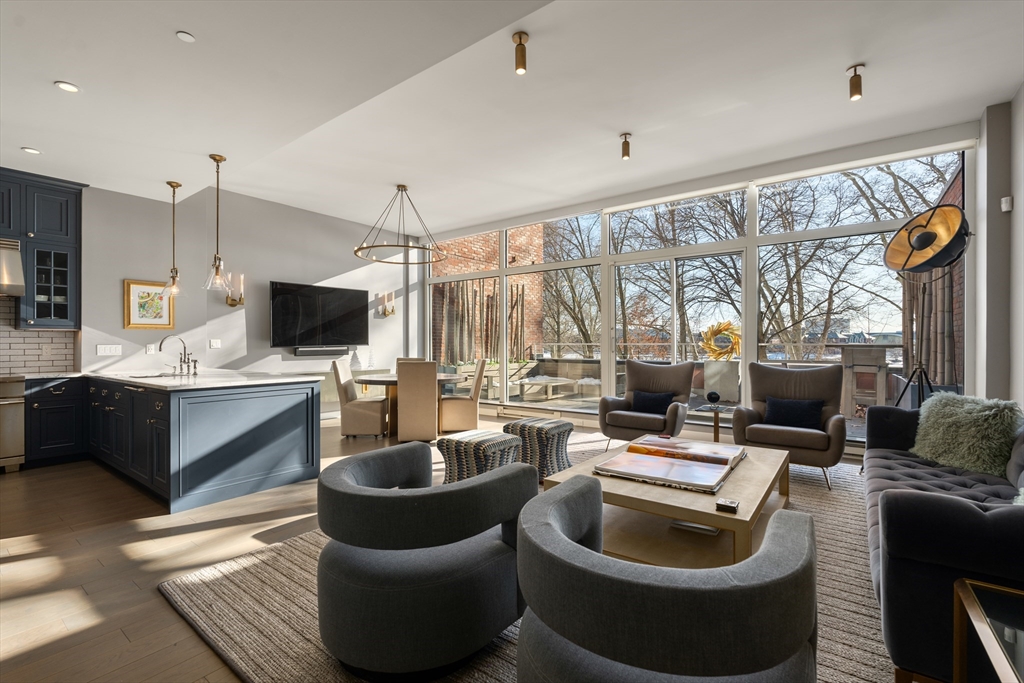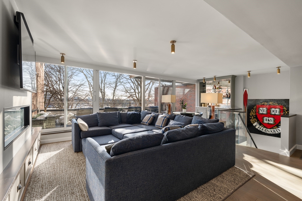 The Residences at the Charles is a luxury full-service building with easy access to the Harvard Kennedy School, JFK Memorial Park, Harvard Business school, as well as fine dining & shopping. Enjoy elegant common areas, curated gardens, and a premier vantage point for the Head of the Charles Regatta. This breathtaking home was fully remodeled by the respected design firm Kristin Paton Interiors. Upon entering, there is a 28' living room with sliding glass doors to the 26' private terrace overlooking Riverbend Park and the Charles River. The dining room opens to the chic kitchen with premium appliances, custom cabinetry, and walk-in pantry. Ascend the glass-enclosed floating staircase to the 26' family room with built-ins, a bar, and 2 sets of sliding glass doors to another 26' private terrace. A tranquil primary suite includes a dressing area. There's a 2nd bedroom suite on this floor. Residents enjoy peace of mind with 24/7 front desk support, a fire suppression system, and elevators.